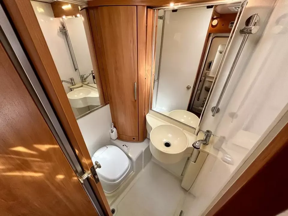 The motorhome comes with a double sized pull down bed which is stored above the cockpit for ease of use and space saving with the other birth being converted from the lounge seating area.