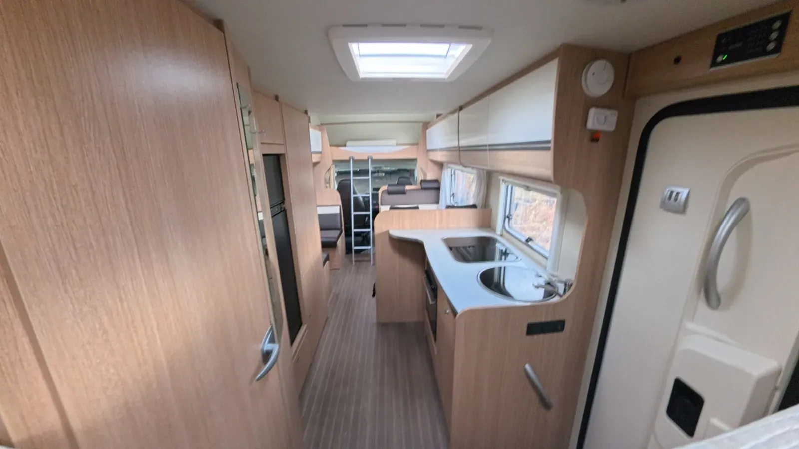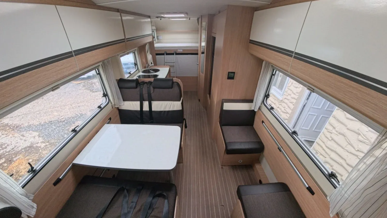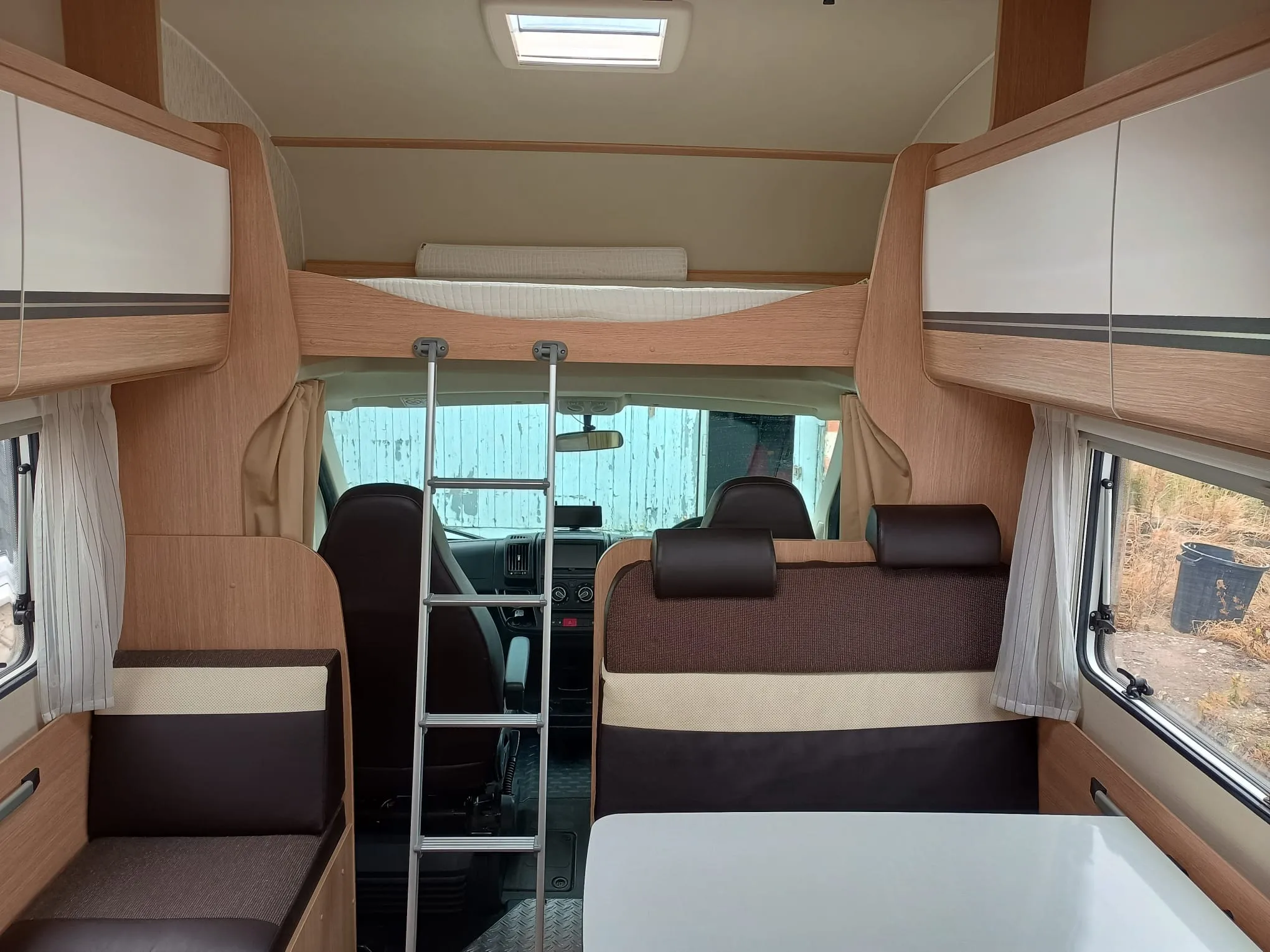 Two bunks are situated at the back of the motorhome. The lower bunk can be folded away to create more space in the rear garage for extra storage.